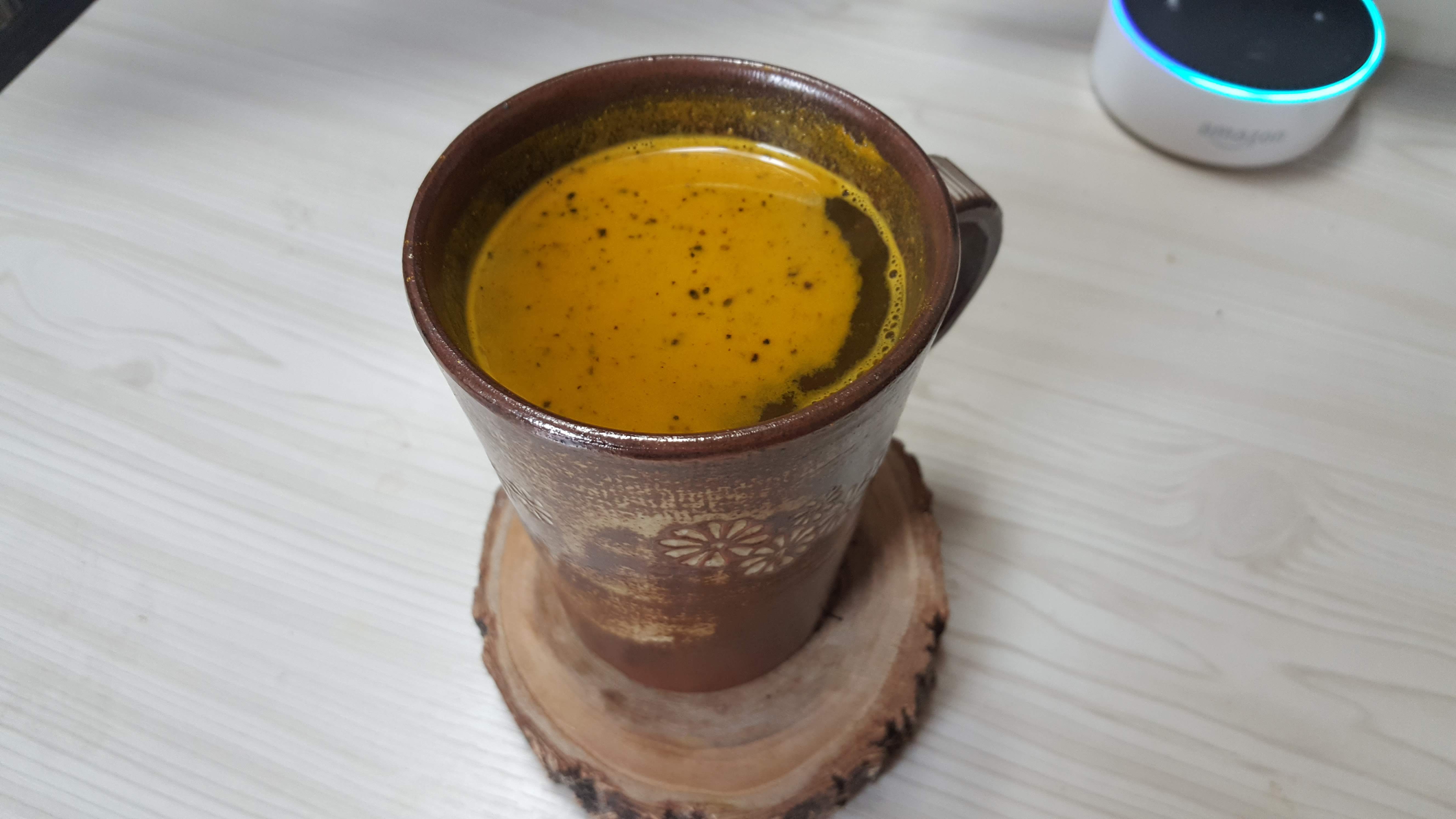 강황가루를 티스푼으로 한 스푼 넣고, 단맛을 좋아하는 사람은 각자 생강청이 아니어도 설탕을 넣어도 된다. 나는 단맛을 좋아하지 않고 매운맛을 즐기는 편이라 통후추 가루를 조금 갈아 넣는다.