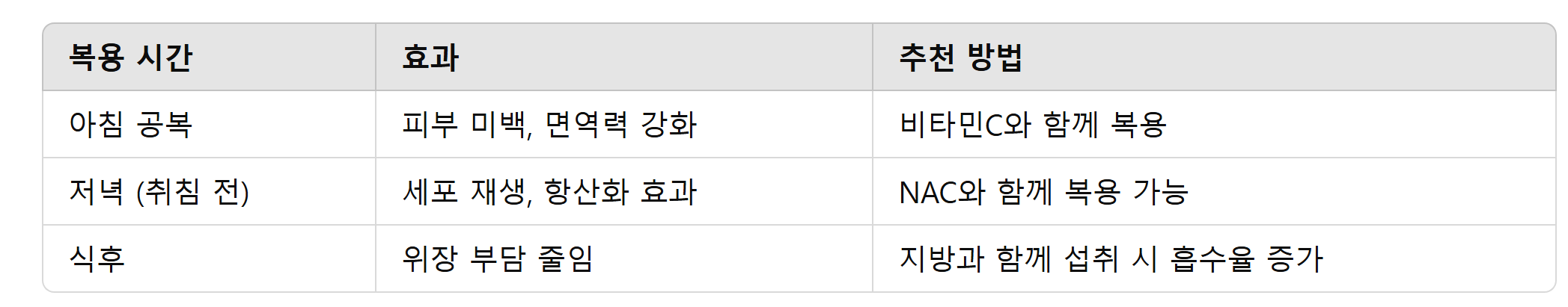 ✅ 추천 방법: 비타민C 또는 NAC와 함께 복용하면 글루타치온 효과를 극대화할 수 있다.