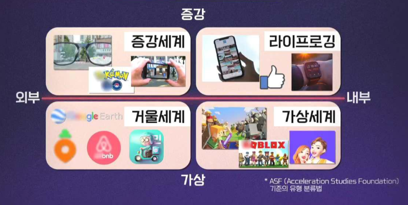 2007년 미국의 비영리 기술 연구단체(ASF)가 메타버스를 네 가지 영역으로 분류했다.