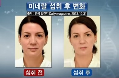 영국의 40대 여성이 소화불량과 만성두통으로 병원을 찾았을 때 신경과 의사와 영양사가 미네랄워터를 마실 것을 권유해 하루 3L씩 4주간 미네랄워터를 음용한 후 변화 모습이다. 눈에 보이듯 젋고 피부도 밝아졌으며 수면의 질이 좋아지고 피로감도 감소했다. 미네랄이 항산화 역할도 하기 때문이다.