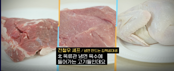 옥류관 냉면 육수는 소 양지, 돼지 앞다리살, 닭 한 마리를 모두 사용하는 독특한 방식으로 만들어진다. 세 가지 고기의 깊고 풍부한 맛이 조화를 이루며, 이 육수가 옥류관 냉면의 핵심이다.
