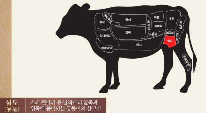불고기용 고기를 살때 보면 설도라고 적혀있는 것을 볼수 있다. 설도는 소의 뒷다리 넓적다리 앞쪽과 위쪽에 붙어 있는 궁둥 살코기로, 한자로 "배설물이 지나가는 길"이라는 독특한 이름을 가지고 있다. 이 부위는 내장과 가까워 약간의 잡내가 날 수 있지만, 한국에서는 양념을 통해 이를 제거하여 불고기 재료로 적극 활용된다. 서양에서는 사료용으로 사용되거나 요리에 잘 쓰이지 않는 부위임에도, 한국 요리에서는 버려질 수 있는 재료를 맛있는 요리로 탈바꿈시키는 지혜가 돋보인다.