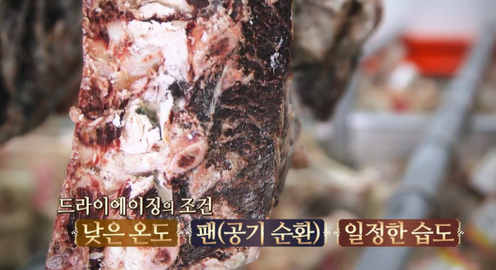 - 고기의 표면을 깨끗하게 다듬고 냉장고 내부에 걸거나 선반에 놓는다.