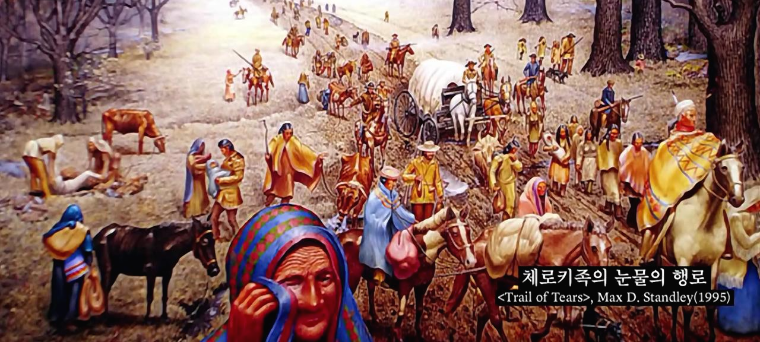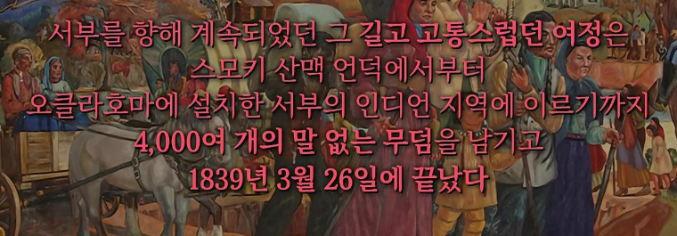 이때 인디언들에게 주어진 하루 식량은 옥수수 한줌, 순무, 끓인 물이 전부였다. 추위 속에서 배고픔과 폐렴으로 수많은 인디언들이 죽어갔고 장례식 치를 겨를도 없이 고난의 이동했다.