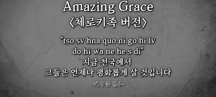 1:30초 부터 체로키 언어로 부른 어메이징 그레이스를 들을 수 있다.