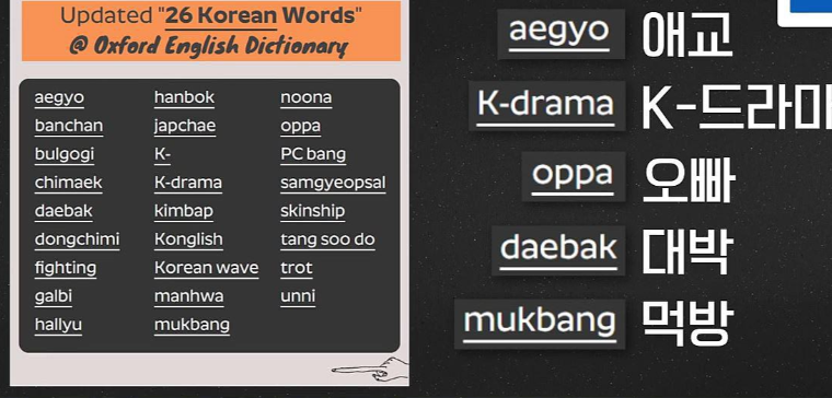 ▷옥스포드 사전에는 한국어 애교, K-드라마, 오빠, 대박, 먹방 등 한국의 단어 26개가 등재되었다. 이름 또한 한국식으로 성을 먼저부르는 등 K-콘텐츠의 파급력을 입증한 작품으로 전 지구적인 신드롬을 일으킨 오징어 게임이다.