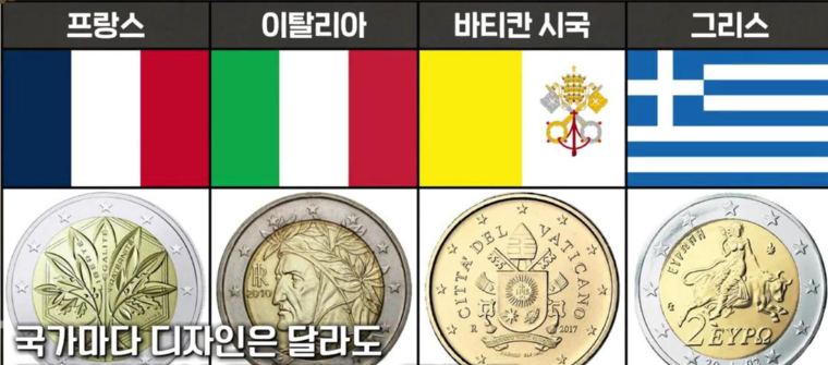 유럽 연합 EU국가들은 유로화를 사용하는 국가마다 동전 디자인이 다르다. 그러나 EU내에서 통용된다. 2유로 동전을 보면 프랑스 오크나무, 올리브 나무가 있는데 힘과 지혜, 자연을 상징한다. 이탈리아 2유로에는 신곡을 쓴 단테가 그려져있다. 바티칸 시국 2유로에는 프란치스코 교황의 문장이 있다.