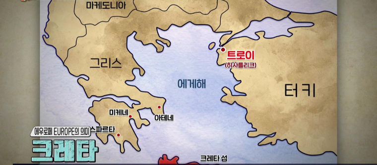 에우로페가 페니키아에서 건너와 자리를 잡은 장소가 그리스의 크레타섬이다. 페니키아(Phoenicia)는 지금의 레바논, 시리아, 이스라엘 북부 등 지중해 동쪽 지대의 고대 지명이자 도시국가들을 말하는 곳으로 아름다운 에우로페에게 반한 제우스가 황소로 변신을 해서 그녀를 납치해서 크레타섬으로 향했고 그곳에서 두 사람 사이에 태어난 미노스가 태어났다. 미노스(Minos) 그리스 신화에 나오는 크레타의 왕 미노스 문명(=에게 문명)은 미노스의 이름에서 비롯되었다.