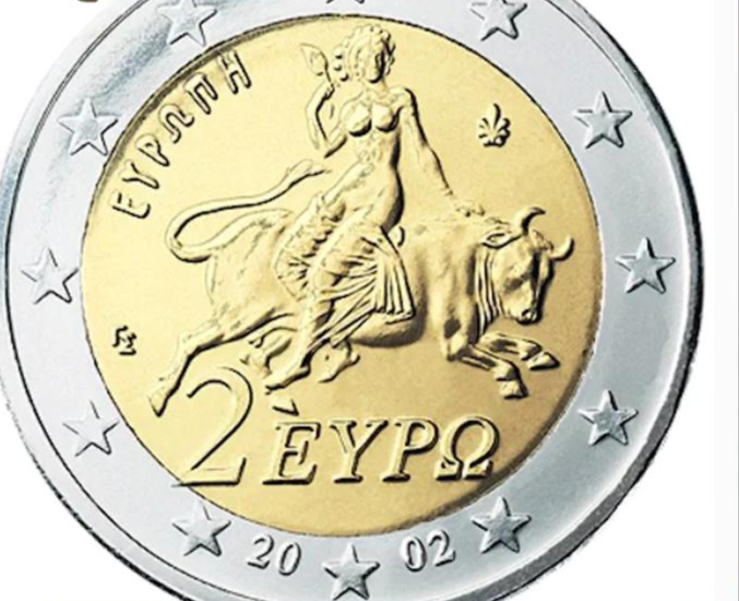 그리고 그리스는 소를 타고 있는 여인이 그려져 있는데 제우스에게 납치당한 페니키아의 공주 에우로페이다.