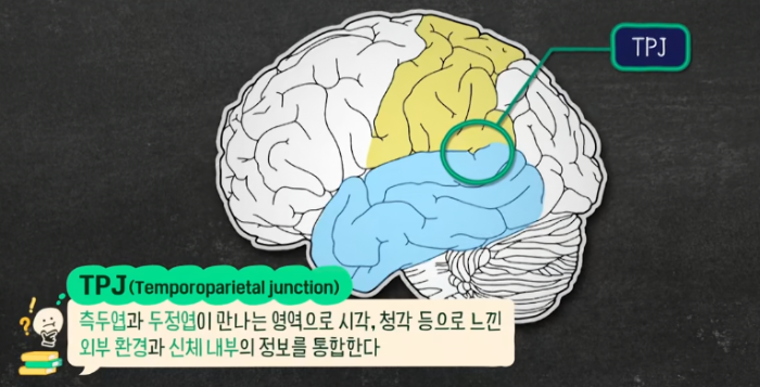 뇌 속 측두엽 쪽 TPJ 는 시각, 청각, 촉각을 하나로 묶어주는 영역이 있는데 이 부분에 마비가 있는 환자들이 공통적으로 유체이탈 현상을 경험한다는 것을 발견했다.