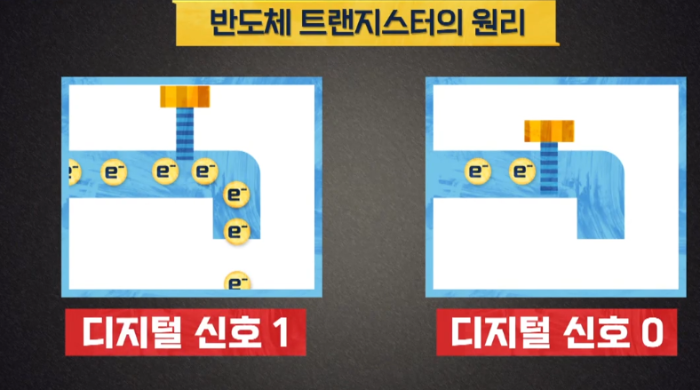 반도체 트랜지스터의 원리는 모든 신호를 디지털 신호 1과 0 으로 표현이 가능하다. 이렇게 수동 증폭기를 대체하려고 만들어낸 트랜지스터가 it 의 시작이 되는 발명이었다.