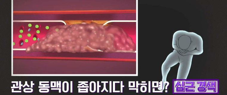 관상동맥이 좁아지면 협심증이 되고 협심증이 심해지면 관상동맥이 좁아지거나 막히면서 심장 근육이 괴사하는심근경색이 된다.