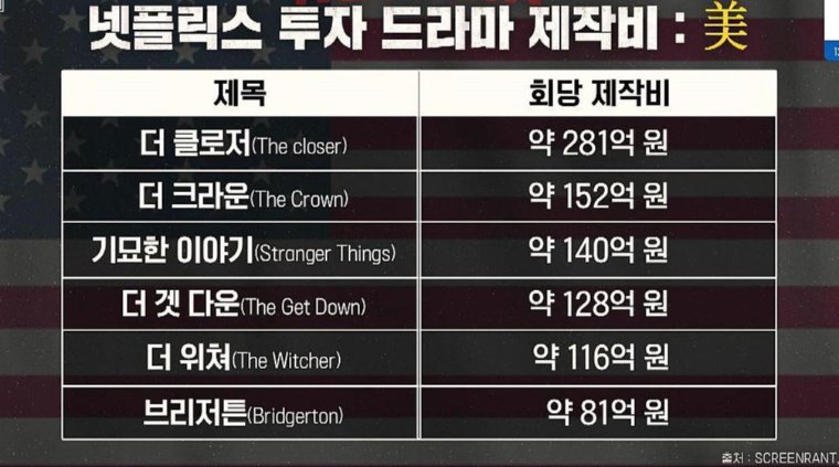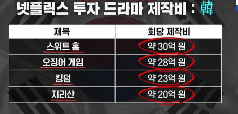 한국 컨텐츠의 경쟁력은 바로 가성비이다. 2021년 넷플릭스가 한국 컨텐츠에 투자하겠다고 발표한것이 5500억원이다. 넷플릭스는 K-콘텐츠의 투자대비 가성비가 높다고 판단해서 투자를 하는 것이다. 한국의 제작비는 외국의 것에 비해 1/10 수준이다. 적은 제작비에도 더 많은 호응을 받은 한국드라마이기 때문에 사업자의 입장에서 한국 콘텐츠만큼 가성비 좋은 것은 없는 것이다.